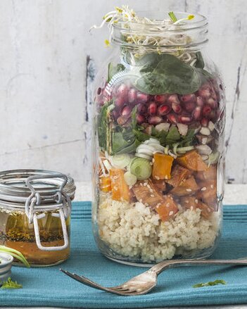 1. Jáhly i batáty nechte vychladnout a poté salát navrstvěte do sklenic. Zálivku si připravte do skleničky bokem a salát zalijte až těsně před jídlem.