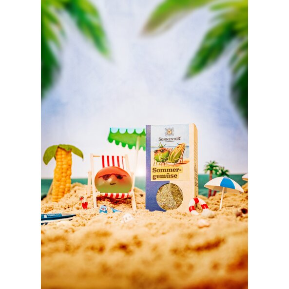 Ein Maiskolben und eine Paradeiser mit Hut, Sonnenbrille und Cocktail sitzen in Liegestühlen am Strand und lassen sich sonnen.