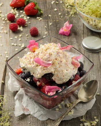 Foto von einer Schale mit Beeren-Blüten Salat. Darin sind verschiedenste Beeren mit weißer Creme und rosa Blüten zu sehen. | © SONNENTOR