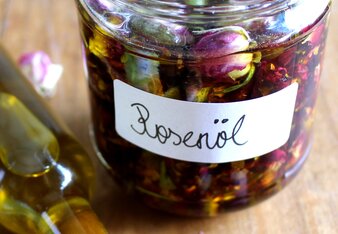 Auf dem Foto ist ein Glas mit Rosenöl zu sehen. Im Glas sind Rosenblüten.  | © SONNENTOR