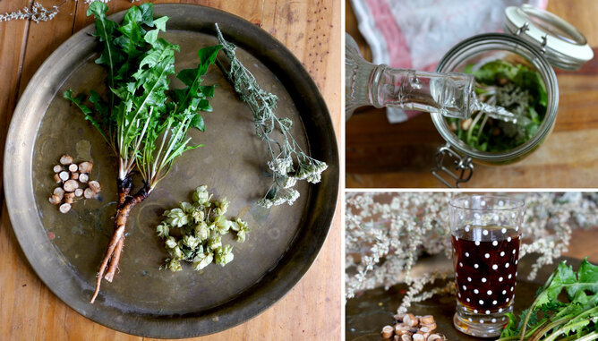 Zubereitung: Löwenzahn im Frühling oder Herbst graben und die ganze Pflanze mitsamt Blättern und Wurzel unter fließendem Wasser säubern. Danach Blätter und Wurzeln trocken tupfen und klein schneiden. Schafgarbe und Beifuß ebenfalls zerkleinern. Alle Zutaten gemeinsam mit dem Alkohol in ein verschließbares Gefäß füllen und 2 - 4 Wochen bei Zimmertemperatur ziehen lassen. Danach abseihen und in Flaschen füllen. Fertig!