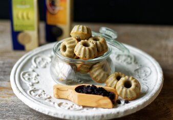 Auf dem Foto sind mini Gugelhupf ohne raffiniertem Zucker zu sehen. Davor ist eine kleine Schaufel mit Rosinen zu sehen. | © SONNENTOR